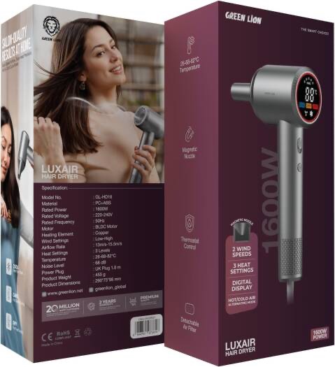 مجفف شعر جرين ليون لوكس إير، 1600 واط، 3 إعدادات حرارة متناوبة 26/68/82 درجة مئوية، تحكم في درجة الحرارة، مستويان للسرعة، محرك بجودة صالونات التجميل، شاشة عرض رقمية، فوهة مغناطيسية، فلتر قابل للفصل (رمادي)
