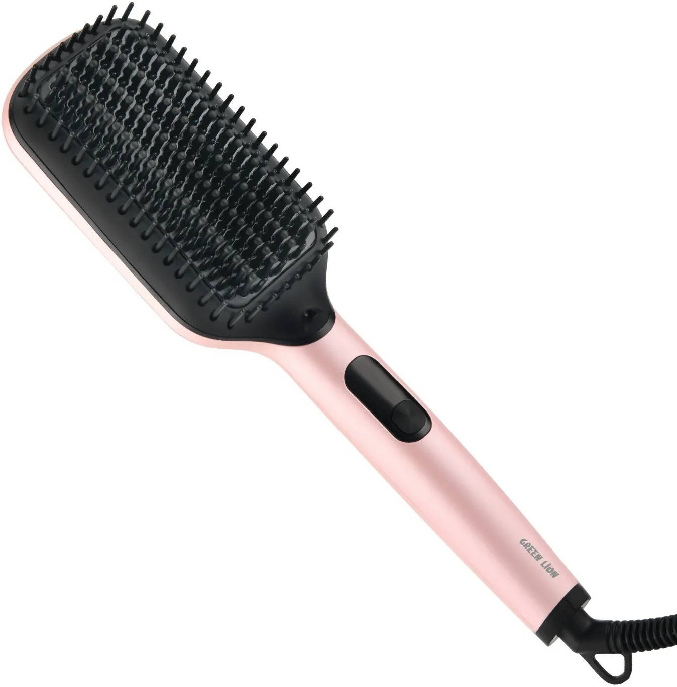 مشط تمليس الشعر من جرين ليون، ألواح مطلية بالسيراميك، تحكم في درجة الحرارة 230 درجة، سلك دوار 360 درجة، إيقاف تشغيل تلقائي بعد ساعة، شاشة LED، مزود بحلقة تعليق، مفتاح تشغيل/إيقاف – وردي